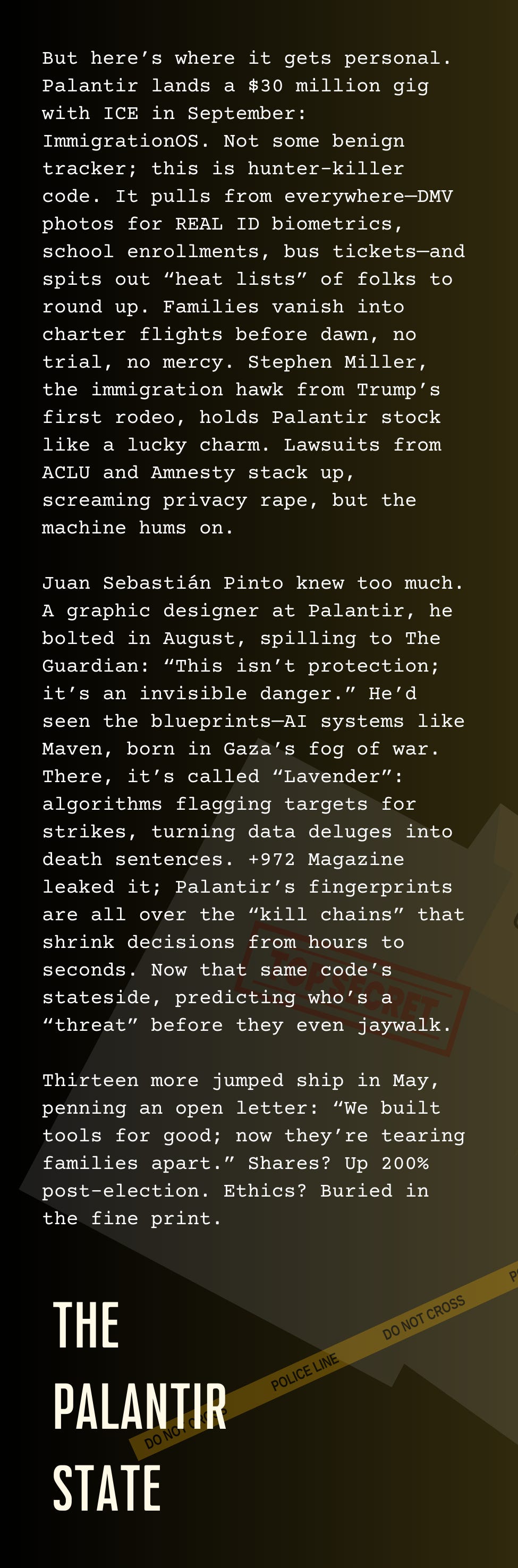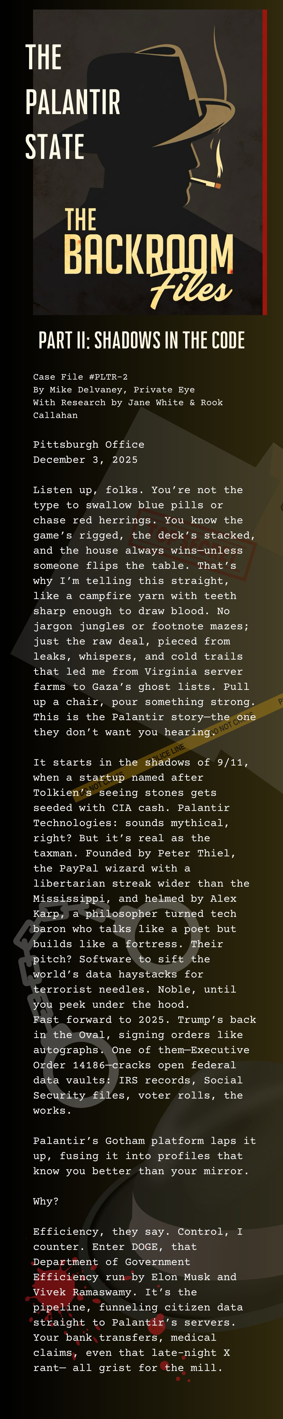 Shadows in the CodeThe Palantir State Part IIDec 03, 202521Share THE BACKRROM FILES©️ The Backroom Files. 2025. All Rights Reserved.PreviousNext